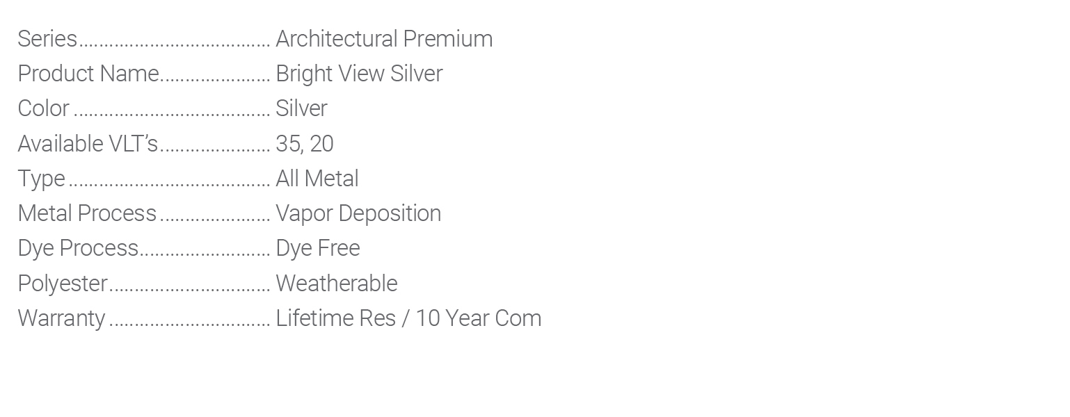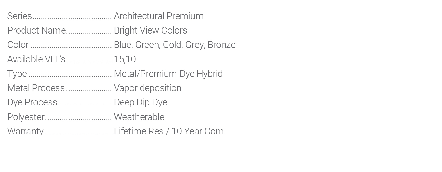 Bright View films marry fast dry, vapor deposition metal with a premium dye, weatherable polyester for extended longevity and the ultimate in solar performance. Bright View films are made with the finest quality raw materials available, and then are put together using today’s most advanced metallizing, laminating and coating technology.
