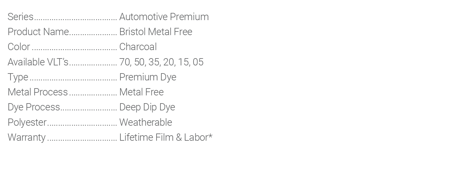 This signal-friendly, color-stable, non-reflective premium dyed film is perfect for today’s highly connected vehicles. Bristol eliminates electronic interference with a thicker, durable 2 ply film that comes in an attractive, metal free charcoal tone.