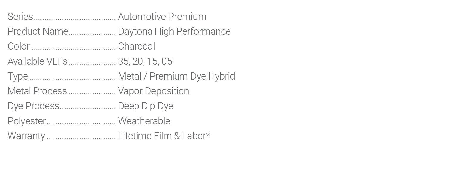 For the best of both worlds, choose Daytona. This high performance hybrid combines a color-stable, non-reflective, premium-dyed film with a metallized layer. The result is superb solar and heat rejection, along with great looks. Plus it’s available in the widest range of color options including neutral, charcoal, bronze and blue.