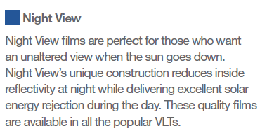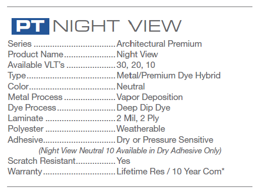 Night View window films from Premium Tech are the perfect choice for people who want unaltered nighttime vision. These films are the best, of the best, because they offer superior performance, beautiful appearance and low inside reflectivity at night. Available in pressure sensitive adhesive, Night View’s handsome neutral appearance is available in all the popular shades and one of the strongest warranties in the industry.