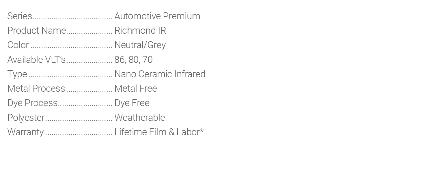 If you are looking for a high infrared, heat rejecting film that’s nearly invisible when installed, metal free Richmond IR fits the bill. These unique nano-technology films provide outstanding heat rejection from higher VLT shades without a dark or reflective appearance. And they’re available in soft grey tones that complement vehicle appearance – all without the risk of electronic signal interference.