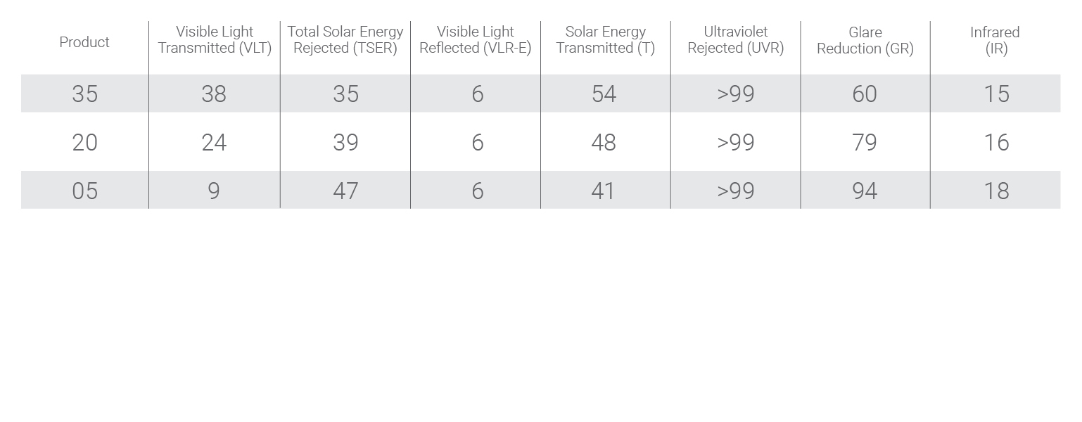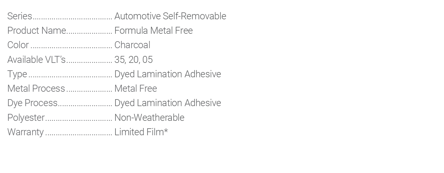 Description The Formula Films are all 2 Ply, Metal Free in Charcoal color in Percentages from 5% to 50%.